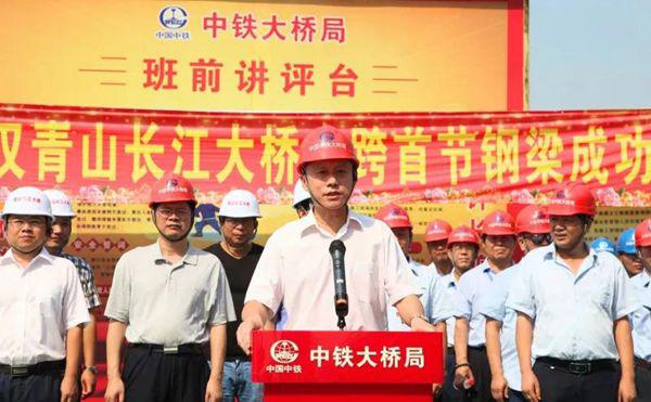 2018年8月8日上午,武漢青山長(zhǎng)江大橋主跨鋼梁首架儀式在武昌岸現(xiàn)場(chǎng)舉行。中鐵大橋局副總經(jīng)理張春新出席活動(dòng)并致詞,武漢交投總經(jīng)理陳順平出席儀式并宣布大橋主跨首節(jié)鋼梁架設(shè)成功,中鐵大橋院副總經(jīng)理莊勇出席了活動(dòng)。